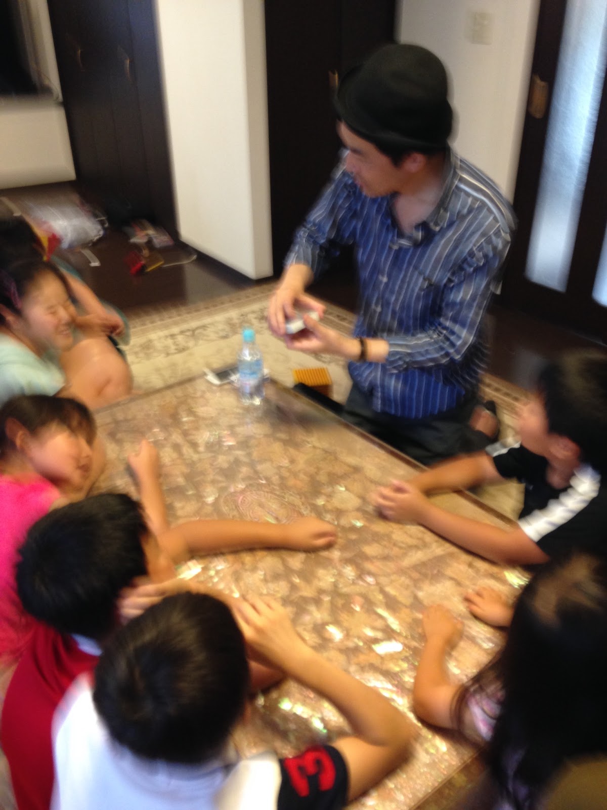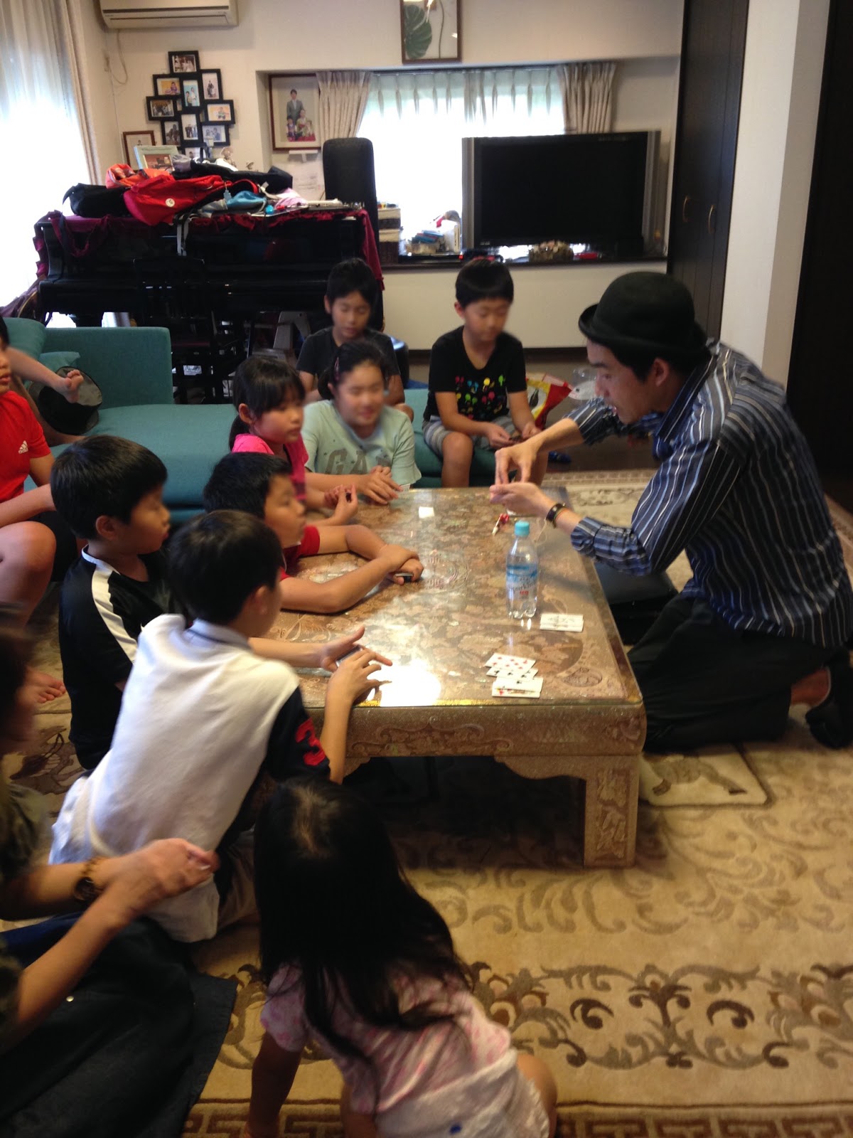 - 全員参加のカードマジック(写真を撮ってもらっていたお母さんが失敗、もうひとりは隠していたカードが行方不明でわからず。その他は全員成功!)