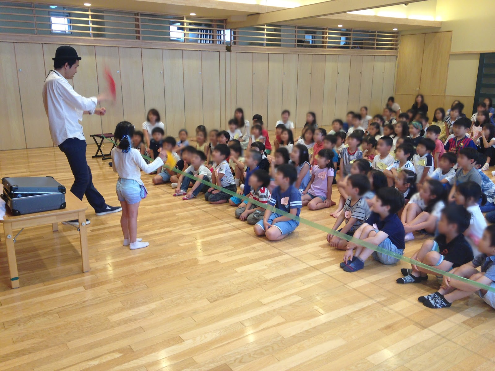 場所は幼稚園の体育館でステージ上ではなく子供たちと同じ高さのところで演りました。