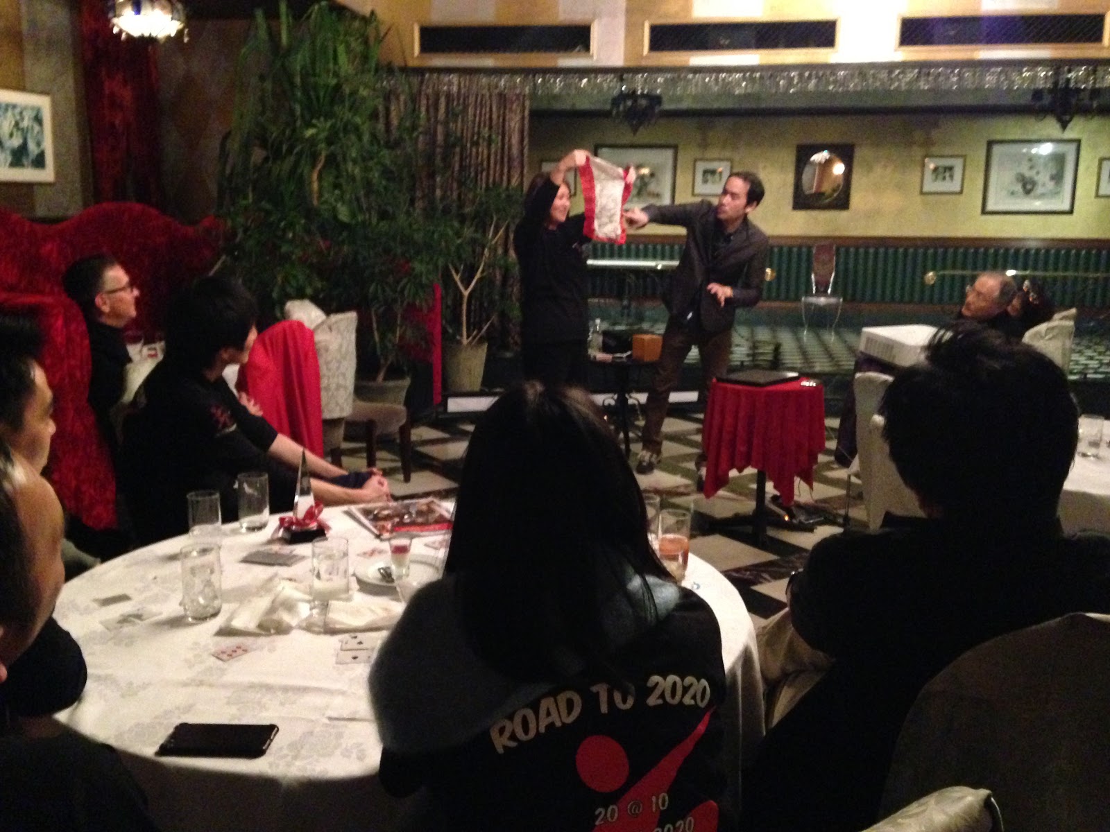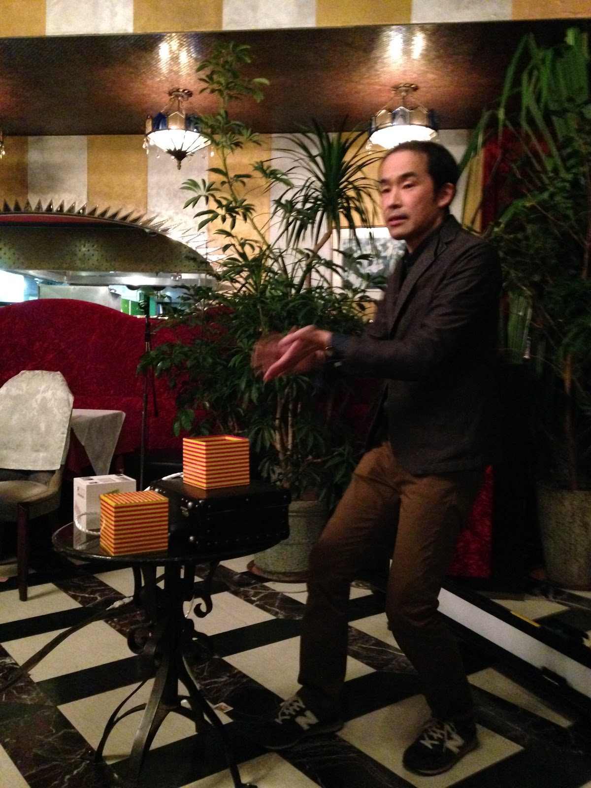 場所は港区の白金台にあるお洒落なレストランで人数は30名ほど、マジックショーは21時過ぎから30分の長さです。