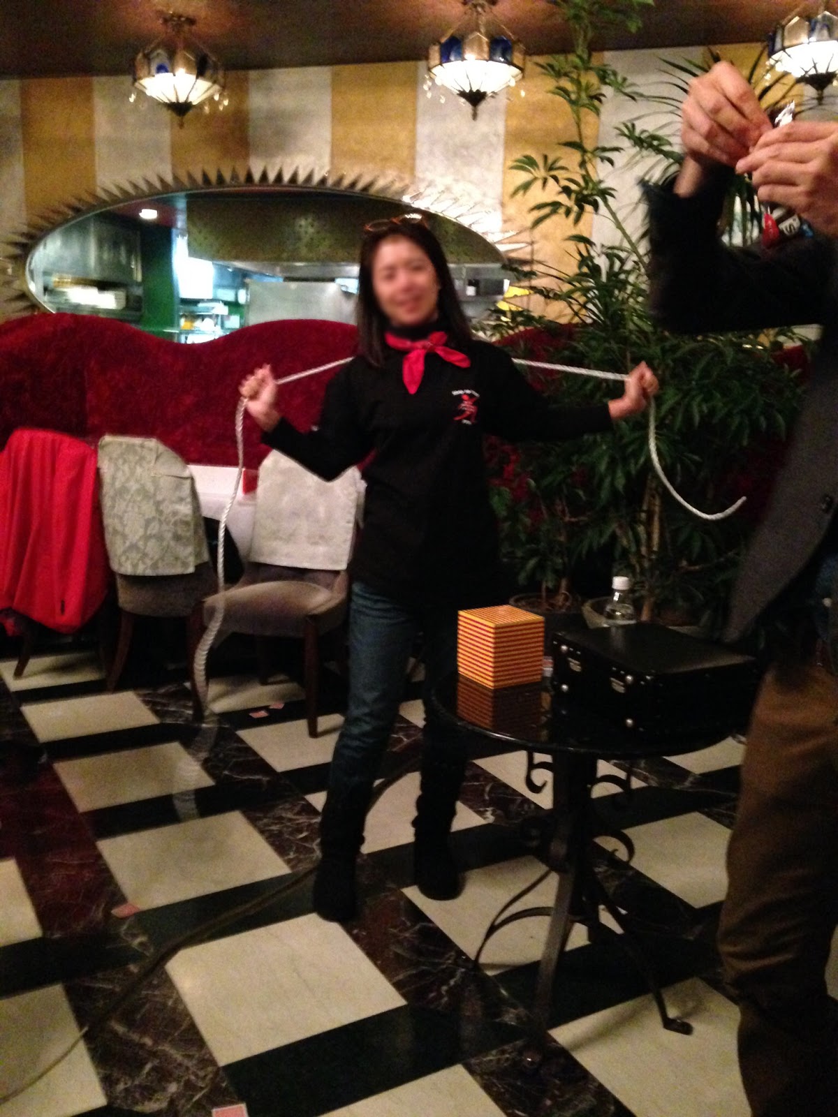 ロープマジックで使うロープを引っ張って調べてもらっているところです。